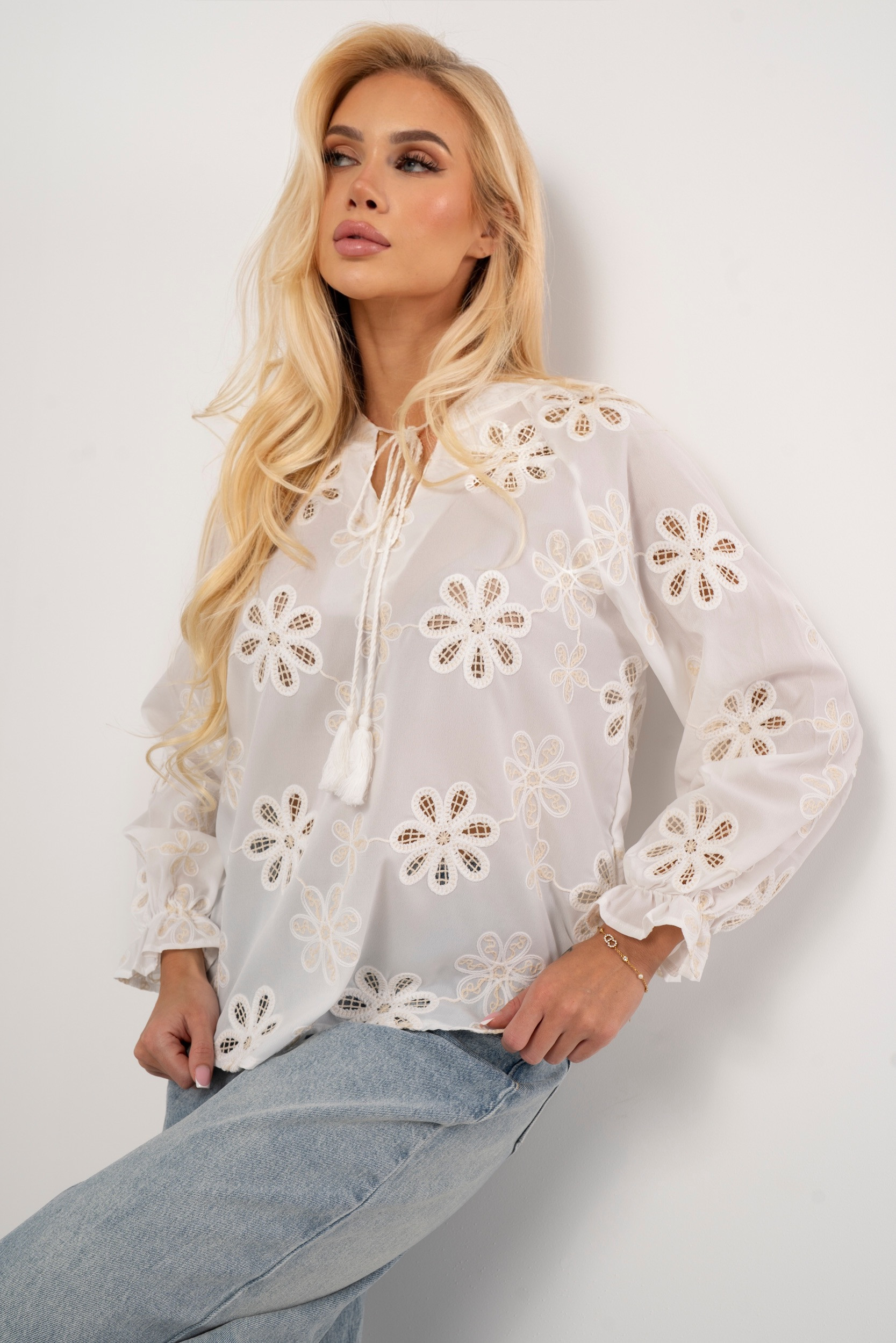 Bluzka o swobodnym kroju wykonana z lekkiej tkaniny z ozdobnym haftem ażurowym w motywy florystyczne. Model z okrągłym dekoltem i rozcięciem w serek wykończonym cienkimi troczkami z dekoracyjnymi pomponami. Długi, bufiasty rękaw zakończony elastycznym mankietem z subtelną falbanką. Starannie rozmieszczone detale z ażurowym wycięciem tworzą efektowną fakturę materiału. Idealna propozycja do stylizacji typu boho, łącząca w sobie klasyczną elegancję z nowoczesnym, kobiecym designem