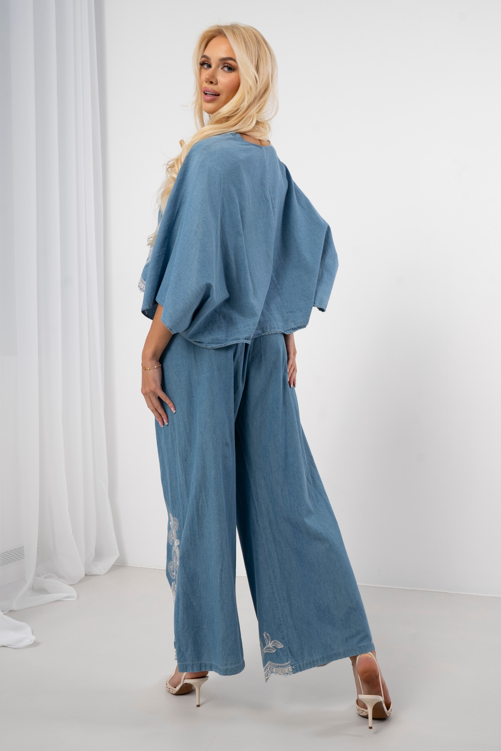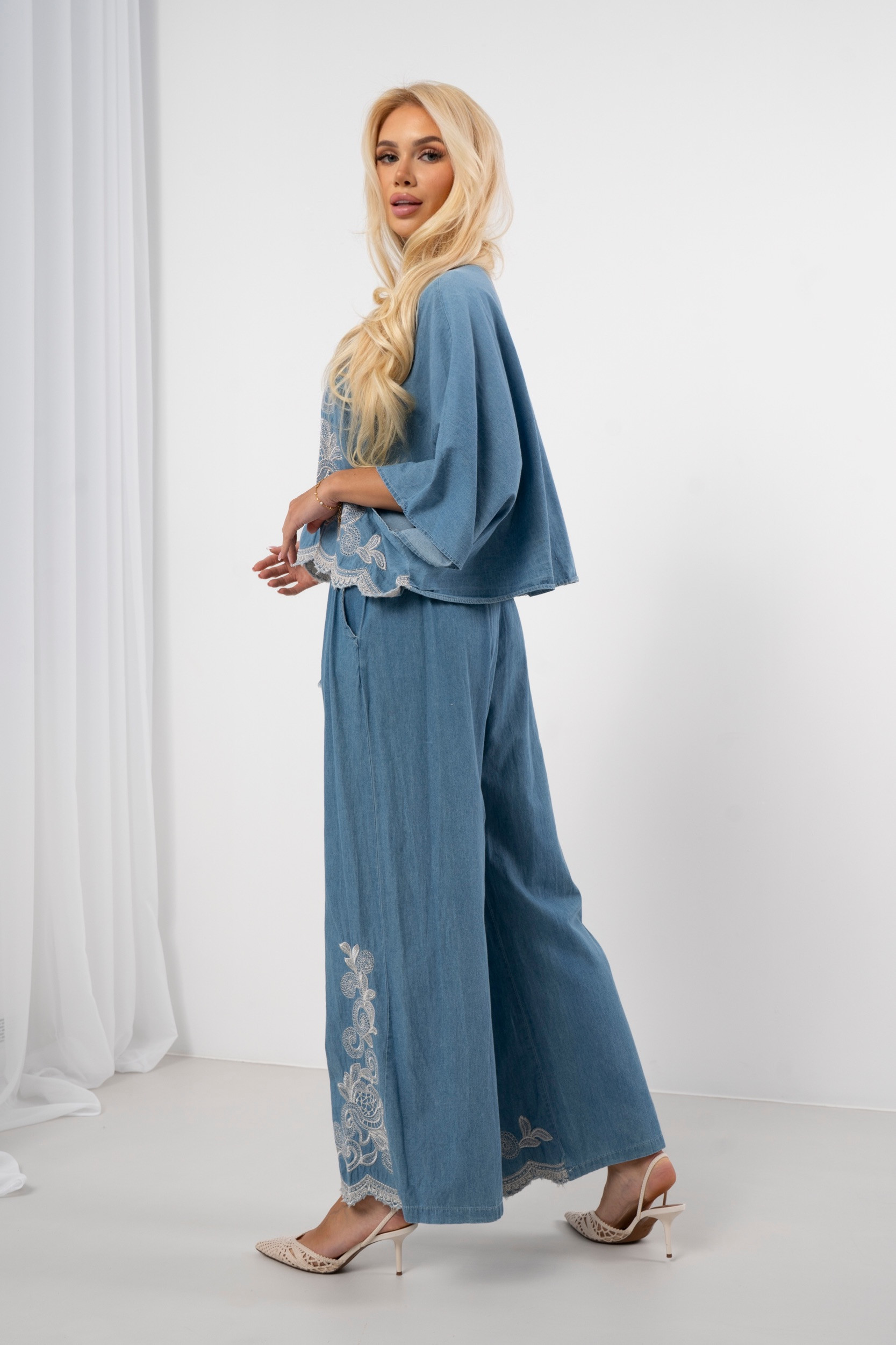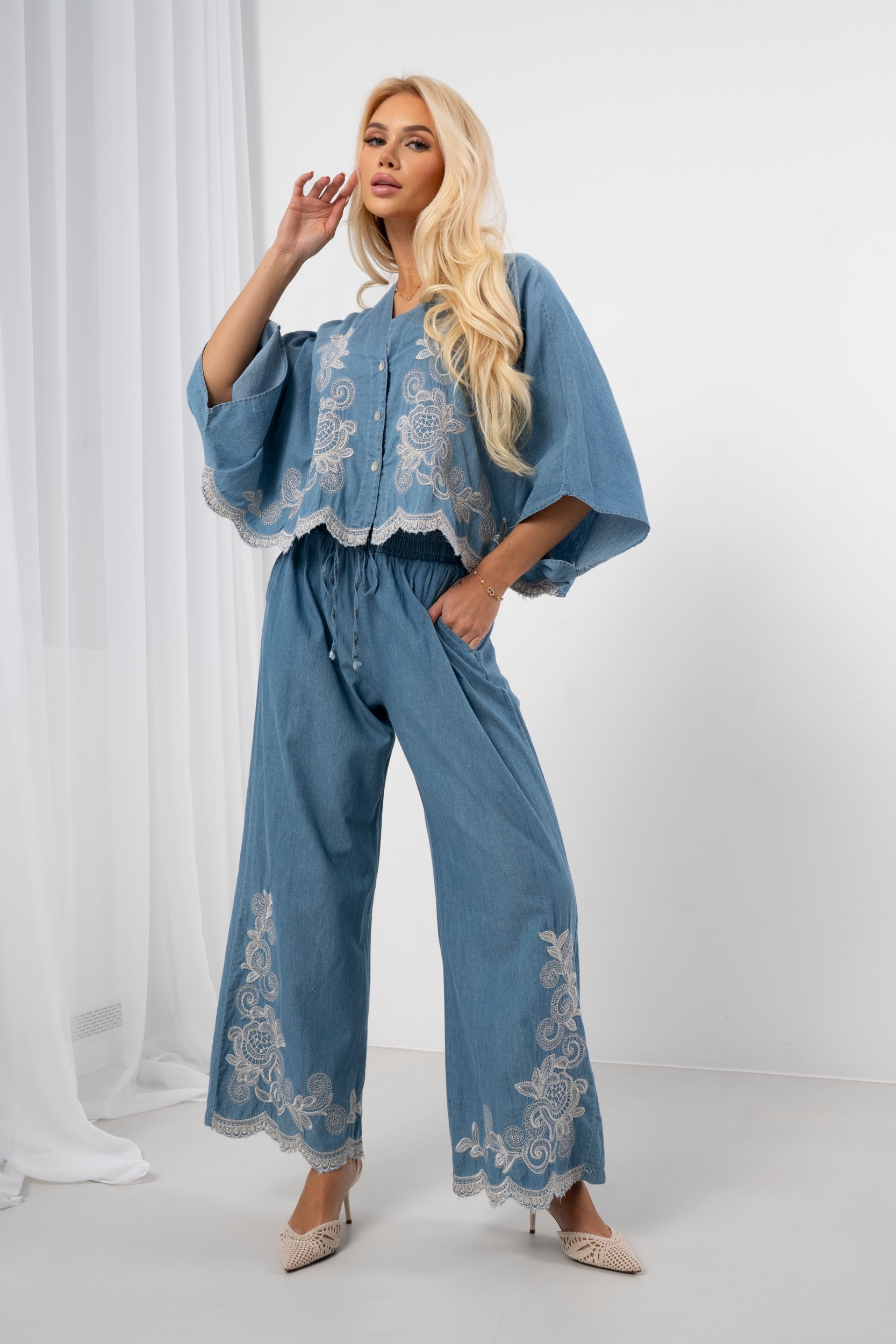 Komplet denim bluzka i spodnie z haftem kwiatowym