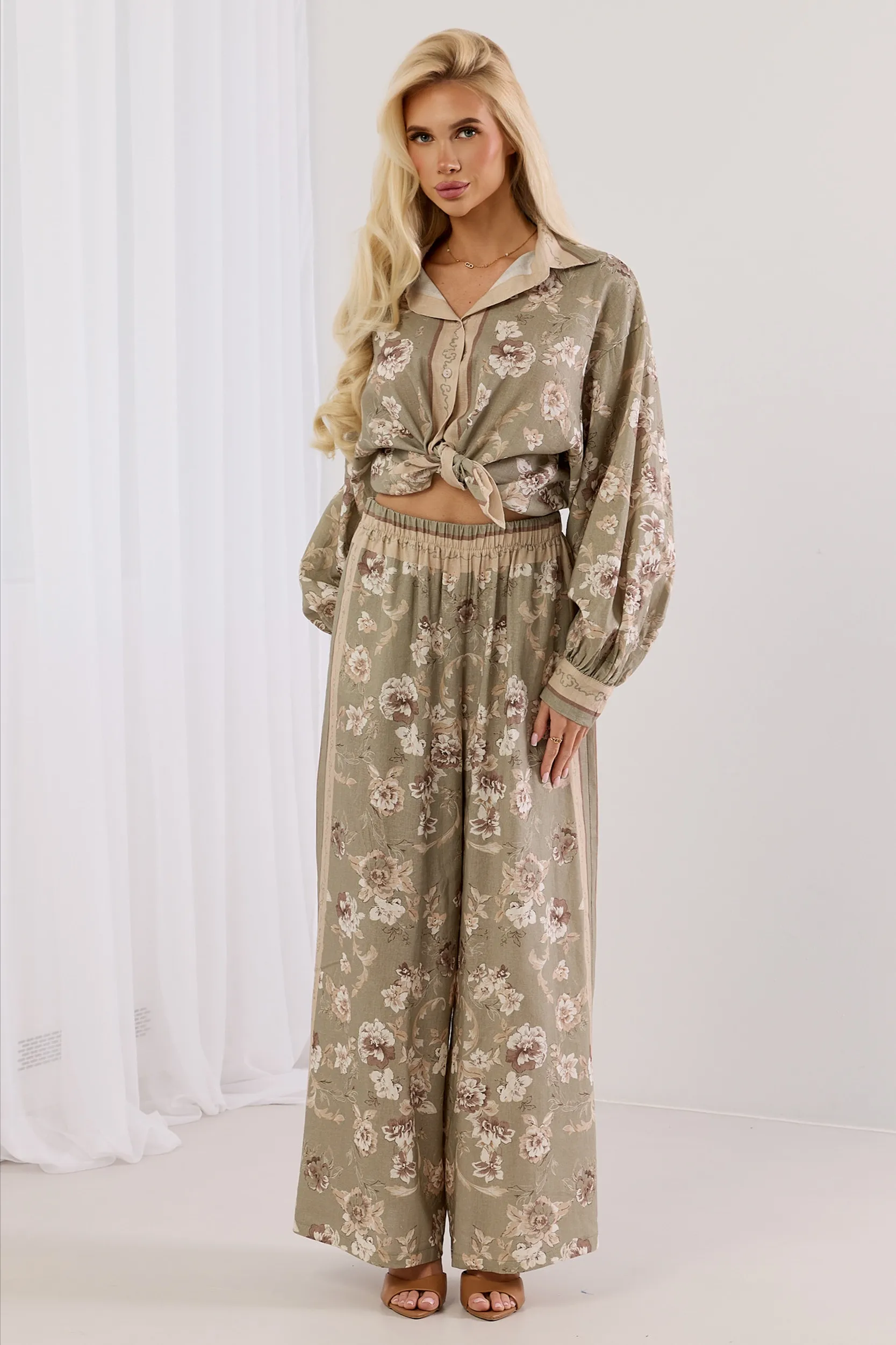 Komplet w kwiaty z koszulą oversize i szerokimi spodniami