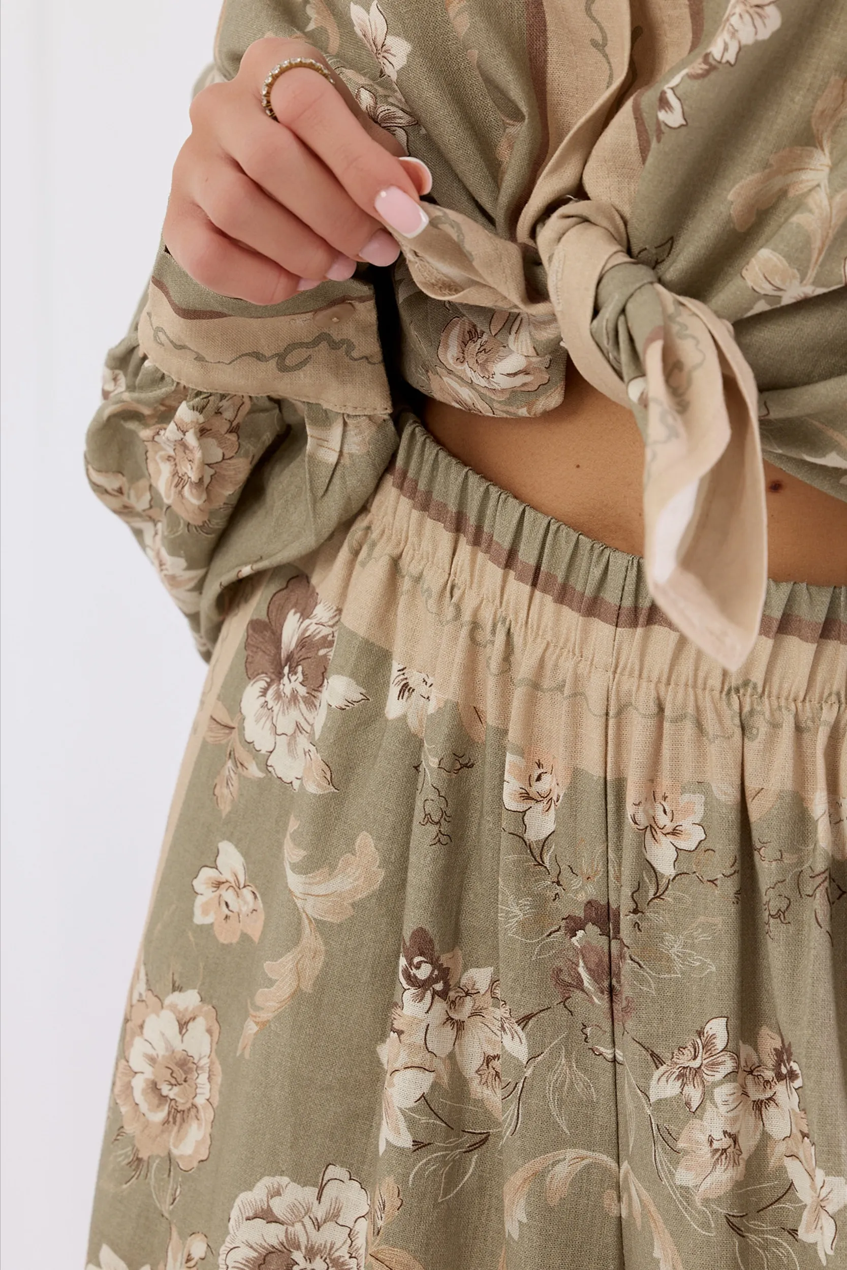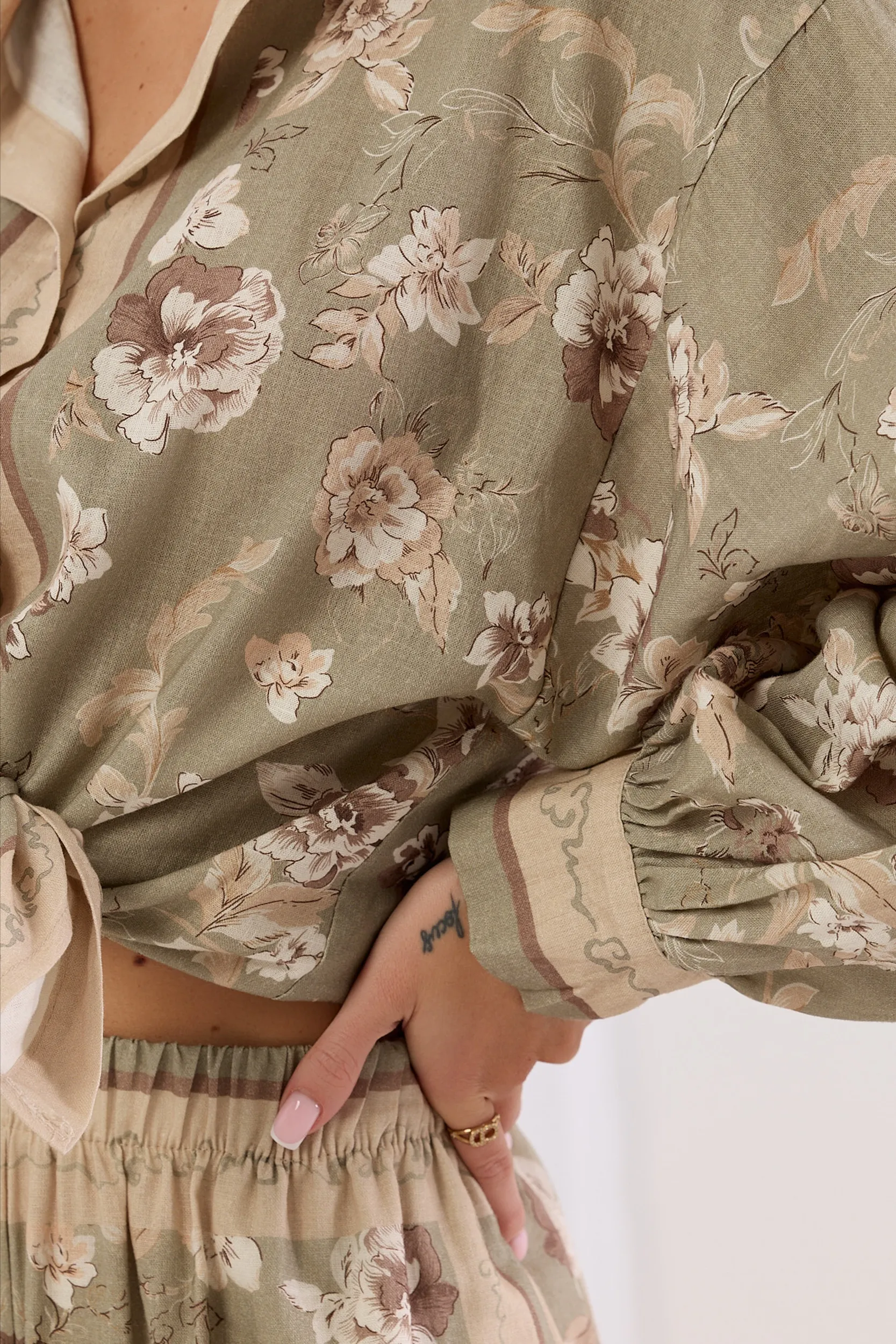 Komplet wykonany z lekkiej tkaniny o wyraźnej strukturze z nadrukiem w motywy florystyczne. Koszula o luźnym kroju oversize z kołnierzykiem i zapięciem na guziki z przodu. Długi rękaw o szerokim fasonie zakończony mankietem oraz dekoracyjne panele z kontrastowym motywem wzdłuż linii zapięcia i przy brzegach. Spodnie z wysokim stanem i szerokimi nogawkami typu wide leg. Elastyczny pas z ozdobnym wykończeniem zapewnia komfort noszenia i idealne dopasowanie. Detal w postaci bocznych lampasów z subtelnym wzorem optycznie wydłuża sylwetkę. Elegancki i swobodny zestaw o nowoczesnym charakterze.