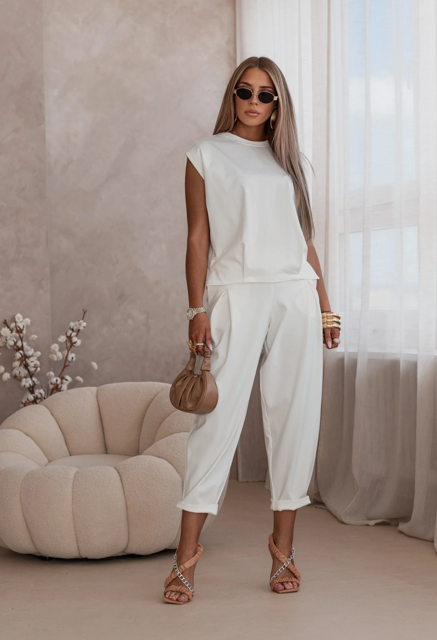 Komplet z dzianiny sportowej. Bluzka na krótki rękaw z logowaną naszywką na karku. Spodnie z lekko zwężaną nogawką, kieszeniami i gumką w pasie.