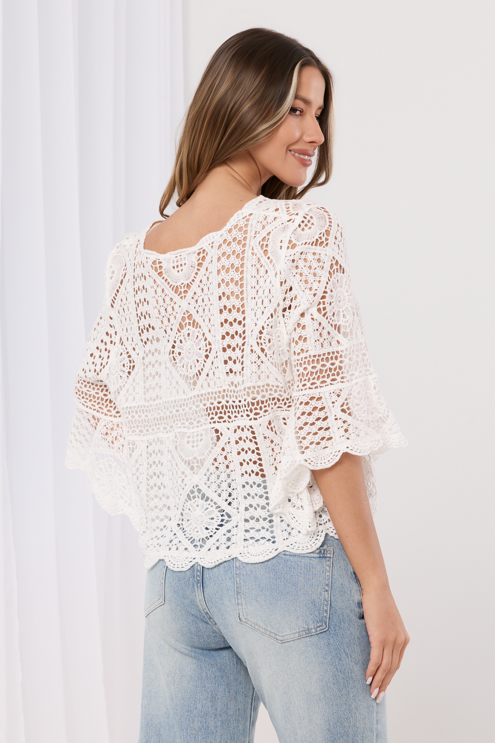 Krótka bluzka o luźnym kroju, wykonana z ażurowej tkaniny z misternymi haftami i splotami typu gipiura. Model z okrągłym dekoltem oraz szerokimi, zwiewnymi rękawami o długości do łokcia, wykończonymi dekoracyjnym, falistym brzegiem. Prześwitująca struktura materiału nadaje całości lekkości, idealnie wpisując się w estetykę boho-chic. Dół bluzki zakończony subtelnym ząbkowaniem. To efektowny element garderoby, który doskonale komponuje się z denimem z wysokim stanem.