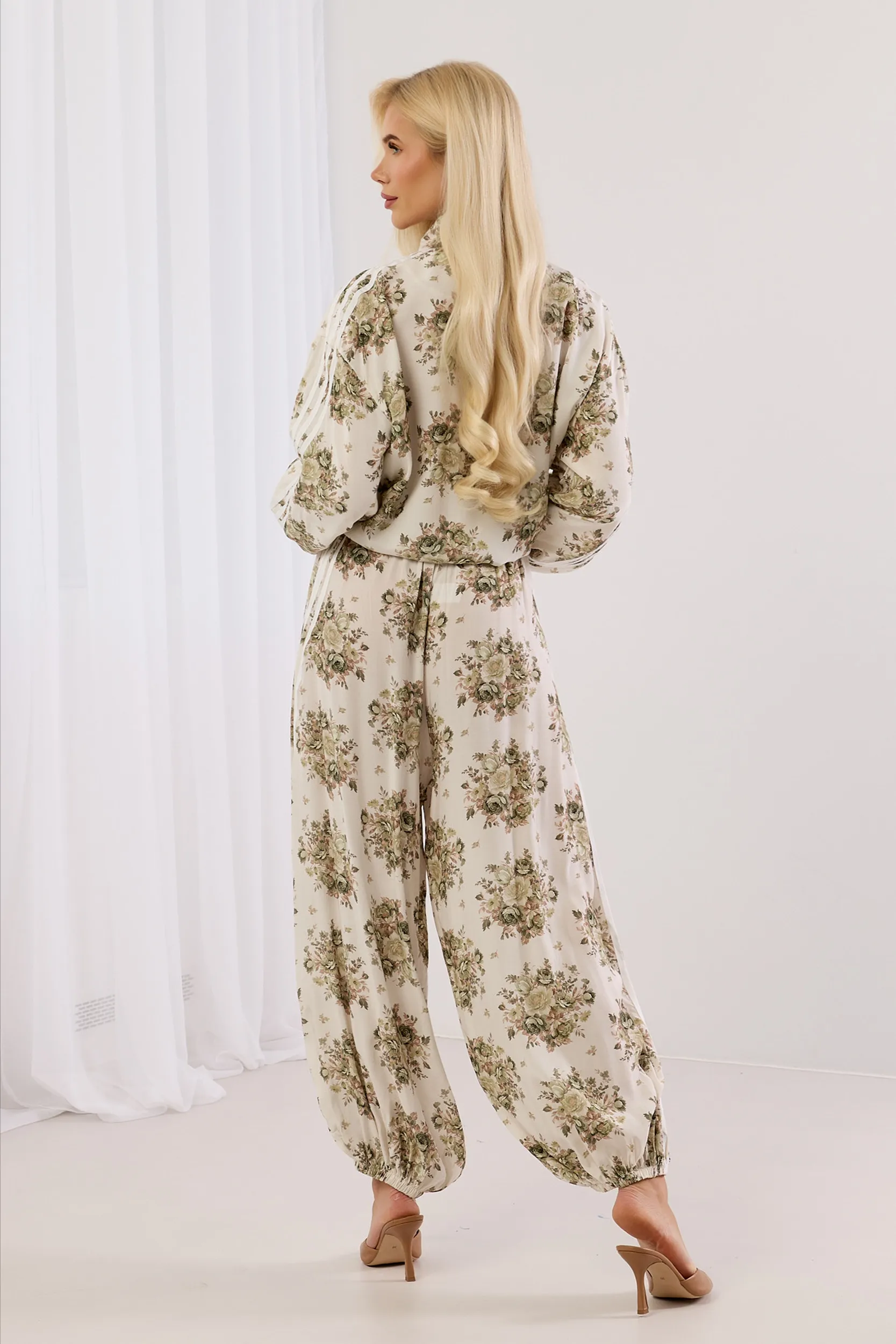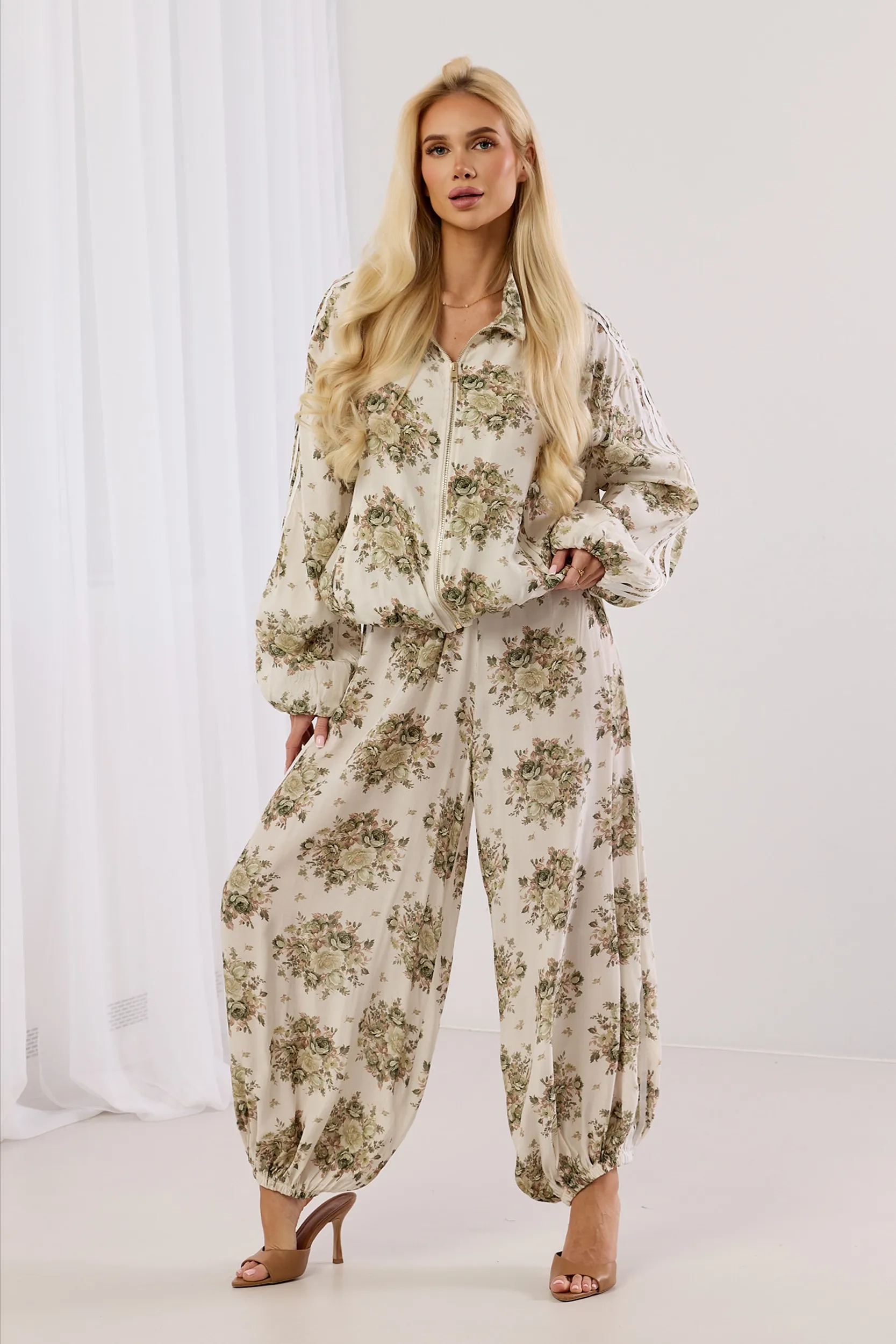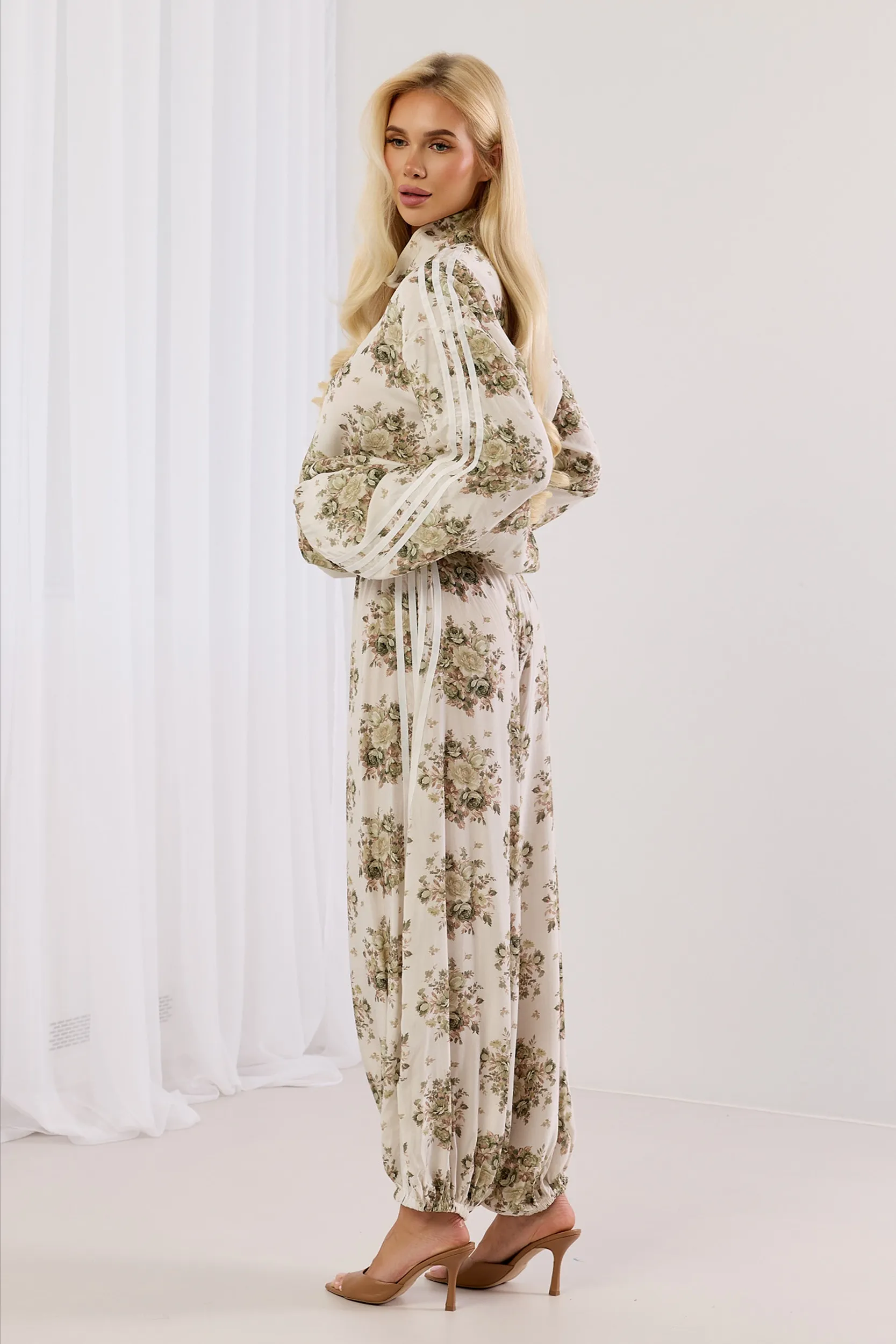 Wiskozowy komplet wykonany z subtelnym motywem florystycznym. Bluza o luźnym kroju z wysokim kołnierzem i zapięciem na metalowy suwak z przodu. Długi, bufiasty rękaw wykończony elastycznym ściągaczem, ozdobiony kontrastowymi lampasami biegnącymi wzdłuż linii ramion. Spodnie typu alladynki z wysokim stanem i elastycznym pasem zapewniającym komfort noszenia. Szerokie nogawki z bocznymi pasami, zwężane u dołu gumką, tworzą nowoczesną i swobodną sylwetkę w miejskim stylu.