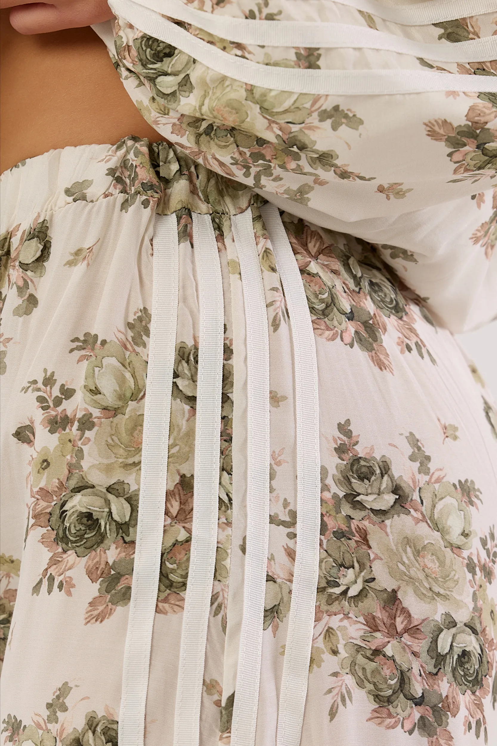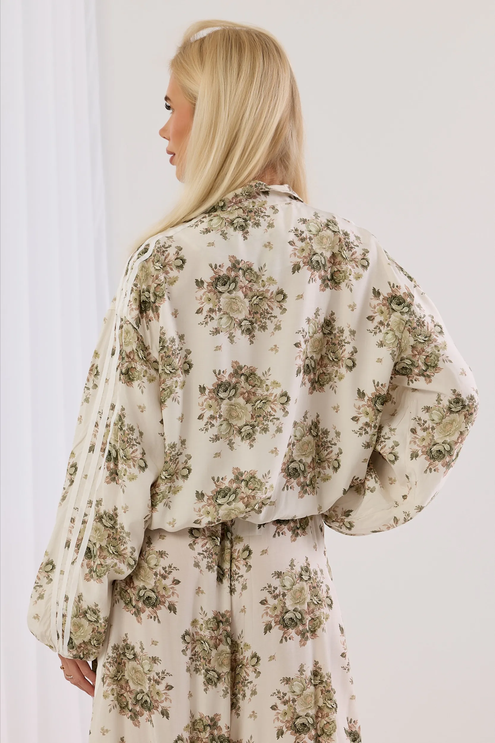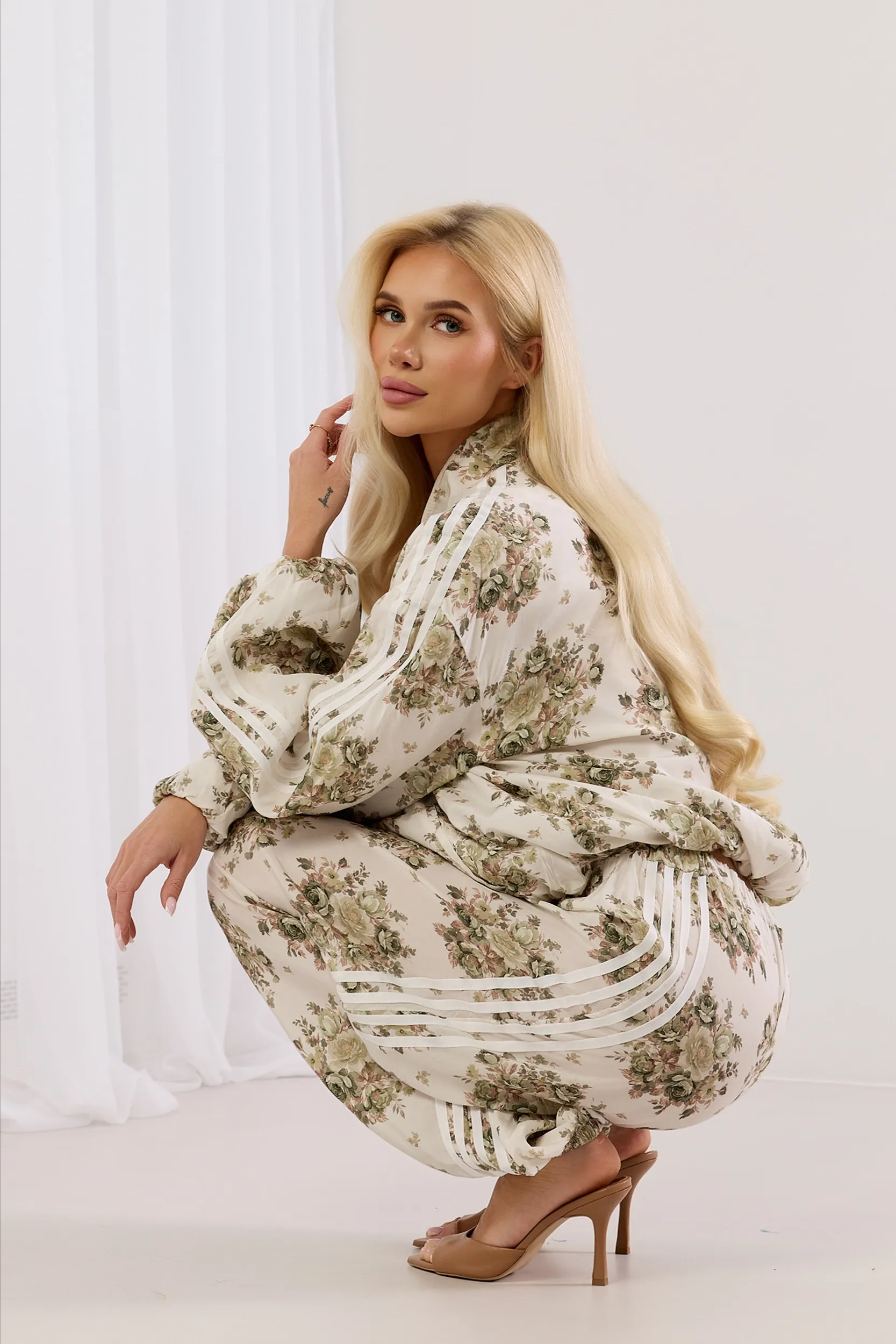 Wiskozowy komplet wykonany z subtelnym motywem florystycznym. Bluza o luźnym kroju z wysokim kołnierzem i zapięciem na metalowy suwak z przodu. Długi, bufiasty rękaw wykończony elastycznym ściągaczem, ozdobiony kontrastowymi lampasami biegnącymi wzdłuż linii ramion. Spodnie typu alladynki z wysokim stanem i elastycznym pasem zapewniającym komfort noszenia. Szerokie nogawki z bocznymi pasami, zwężane u dołu gumką, tworzą nowoczesną i swobodną sylwetkę w miejskim stylu.