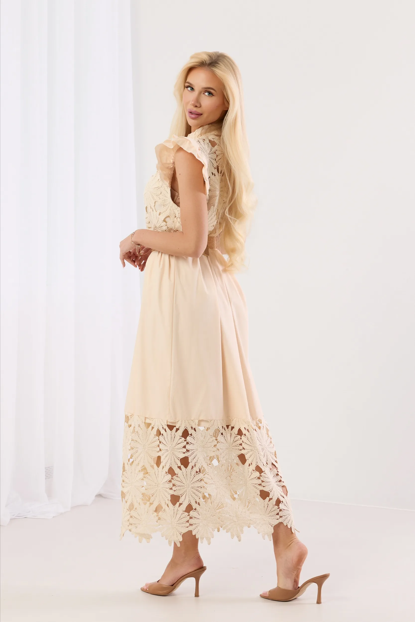 Sukienka maxi z kwiatową koronką i słomkowym paskiem – beżowa