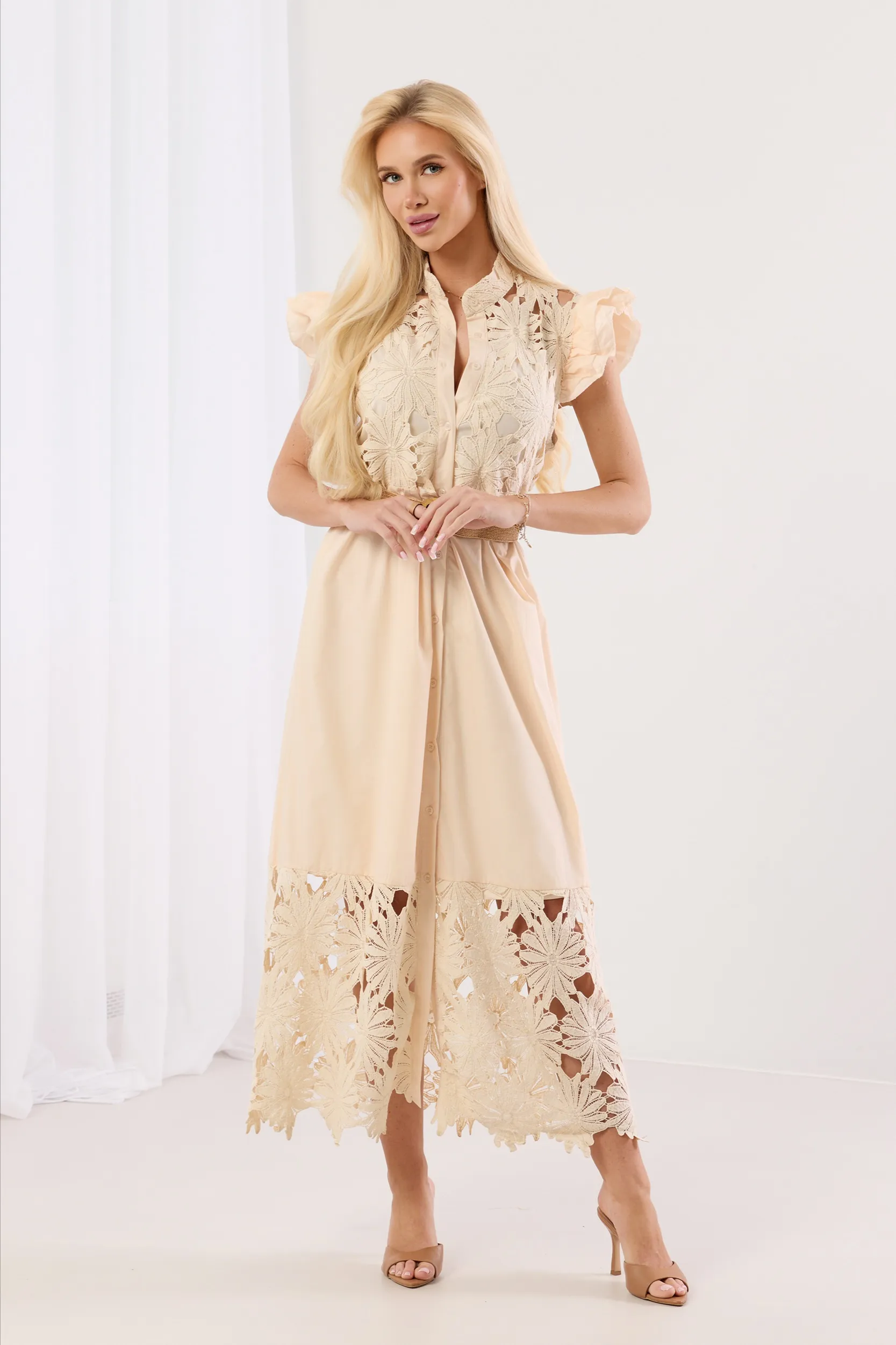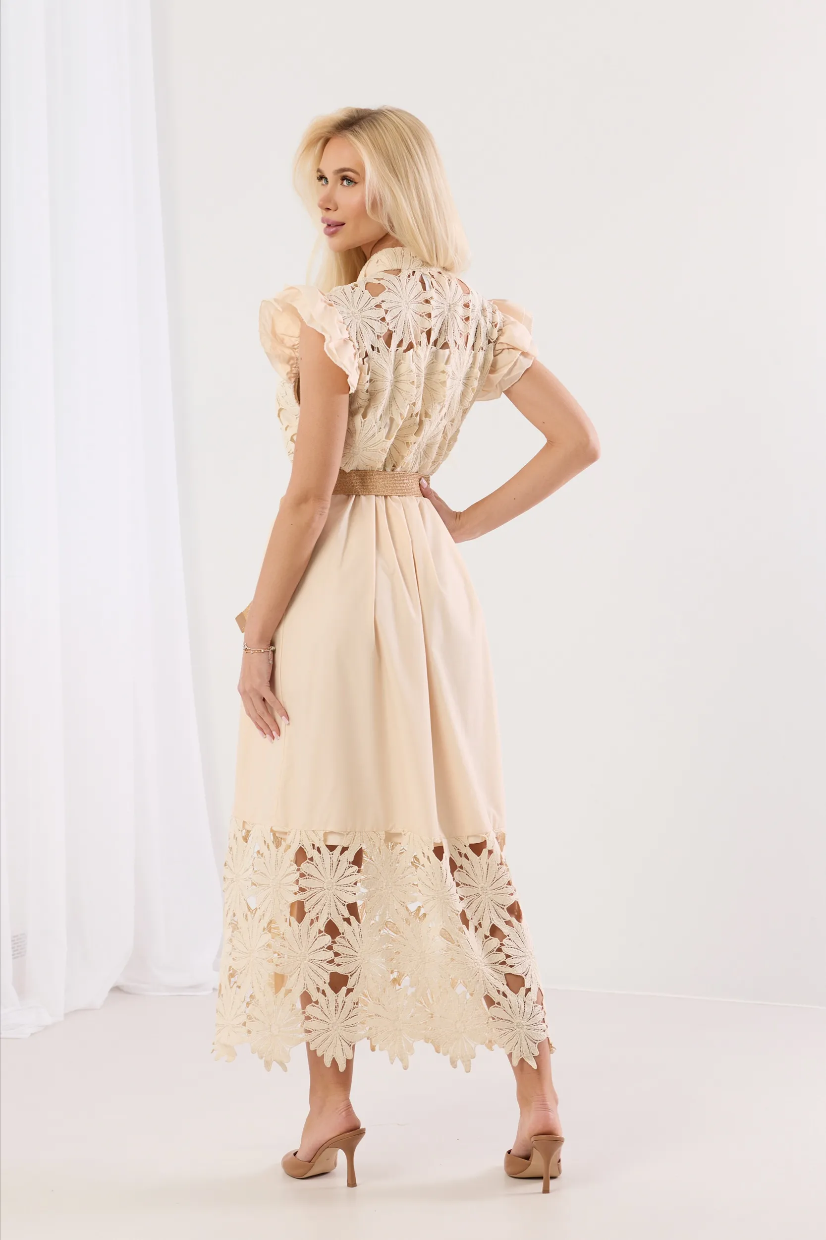 Sukienka maxi o prostej linii wykonana z tkaniny z haftem ażurowym z motywem florystycznym. Kołnierzyk z klapami i krótki rękaw z falbanką nadającą objętości. Odcięcie w pasie podkreślone słomkowym paskiem z okrągłą klamrą. Zapięcie z przodu na guziki. Ozdobne wykończenie dołu z szeroką bordiurą z ażurowymi wycięciami i kwiatowymi detalami. Model łączący romantyczny charakter z nowoczesną formą, idealny do letnich stylizacji o wyrafinowanym wyrazie.