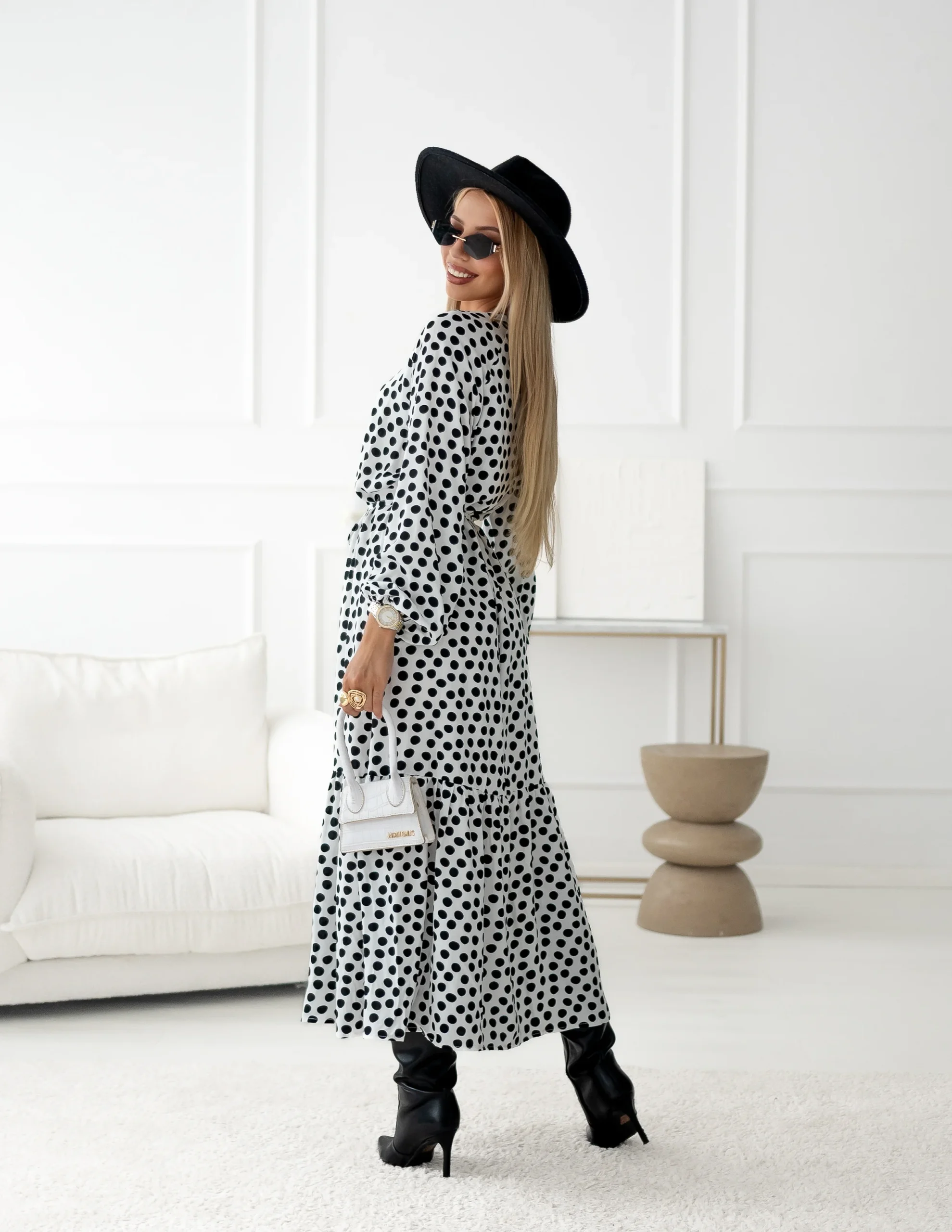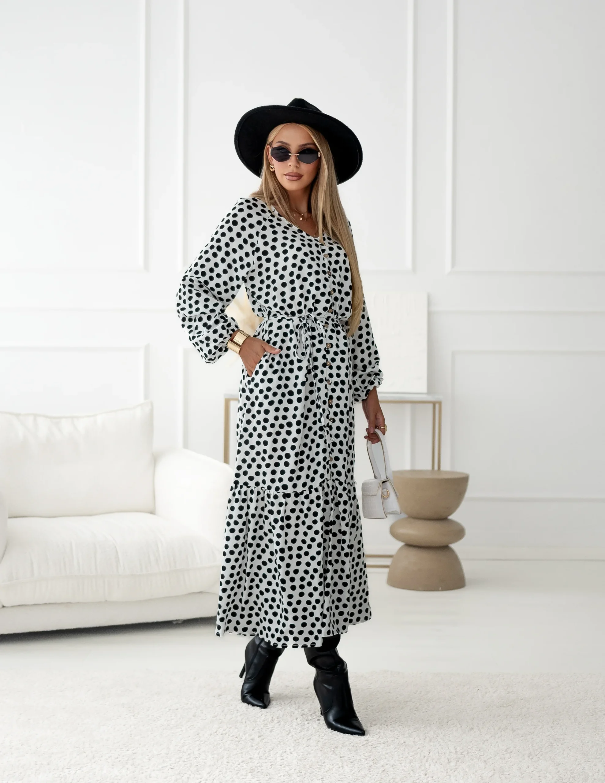 Napisz pierwszą opinię o „Sukienka – print grochy ecru czerń”