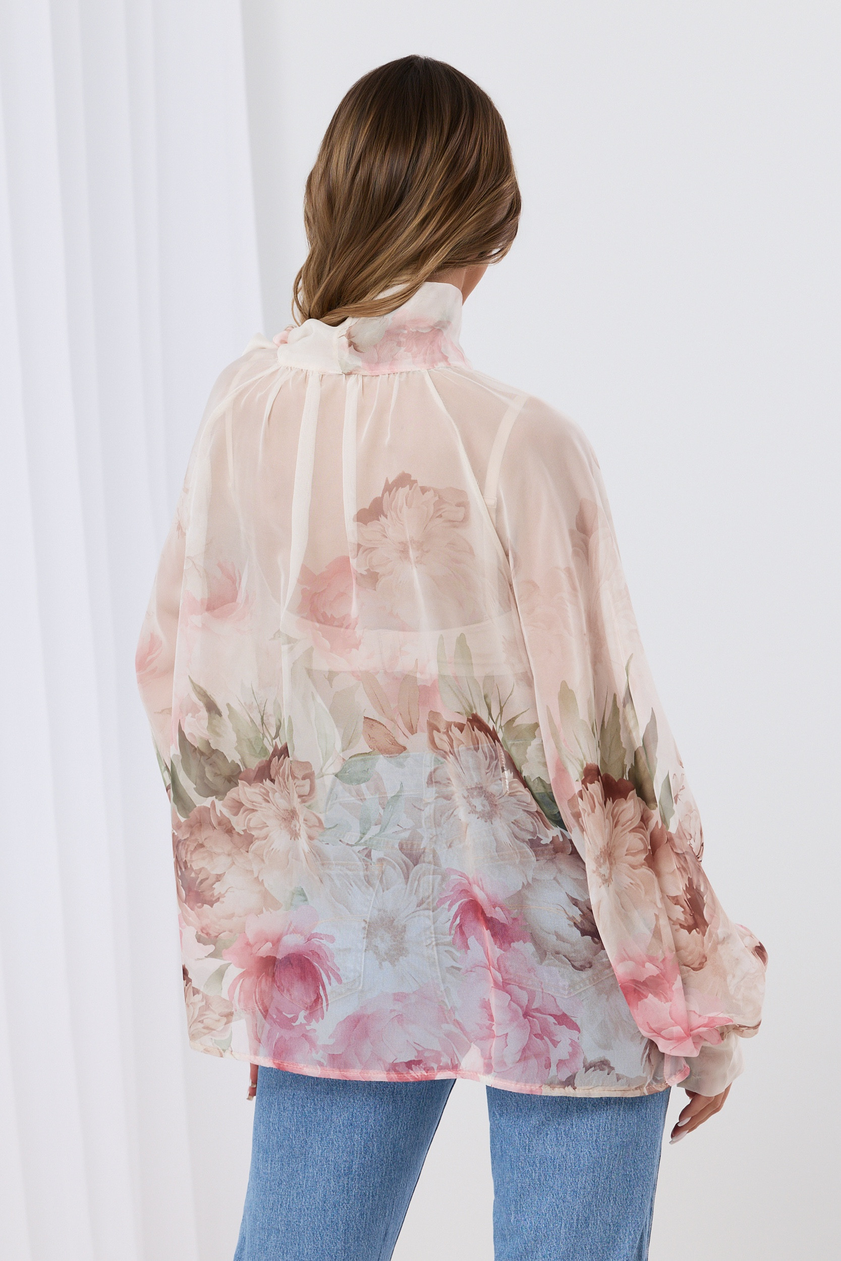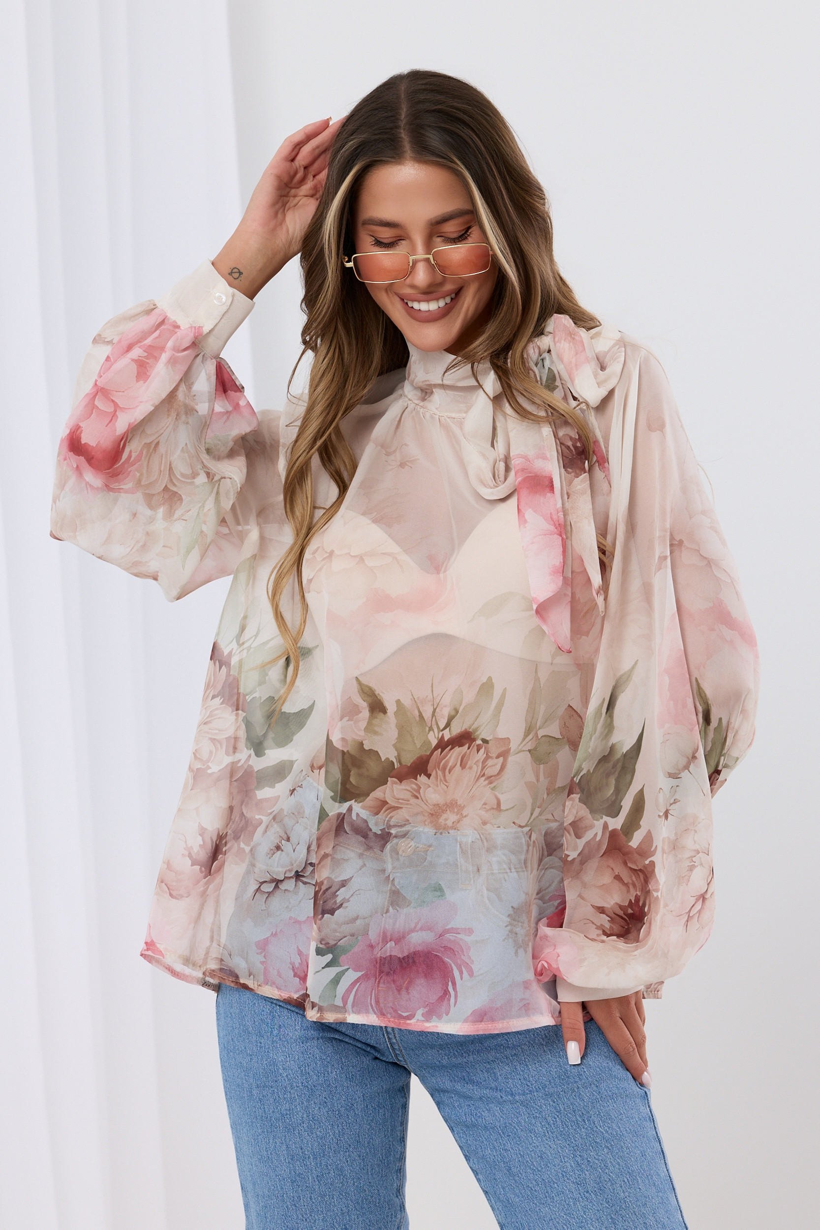 Niezwykle kobieca i zwiewna bluzka idealna na specjalne okazje lub eleganckie wyjścia. Wykonana z delikatnego, półtransparentnego materiału o szyfonowej strukturze, zapewnia lekkość i subtelnie eksponuje sylwetkę. Głównym atutem modelu jest efektowne wiązanie pod szyją na dużą kokardę, dodające całości szlachetnego wyrazu. Całość zdobi subtelny, malarski motyw kwiatowy w pastelowych tonach. Bluzka posiada luźny krój oraz bufiaste rękawy wykończone ściągaczem.